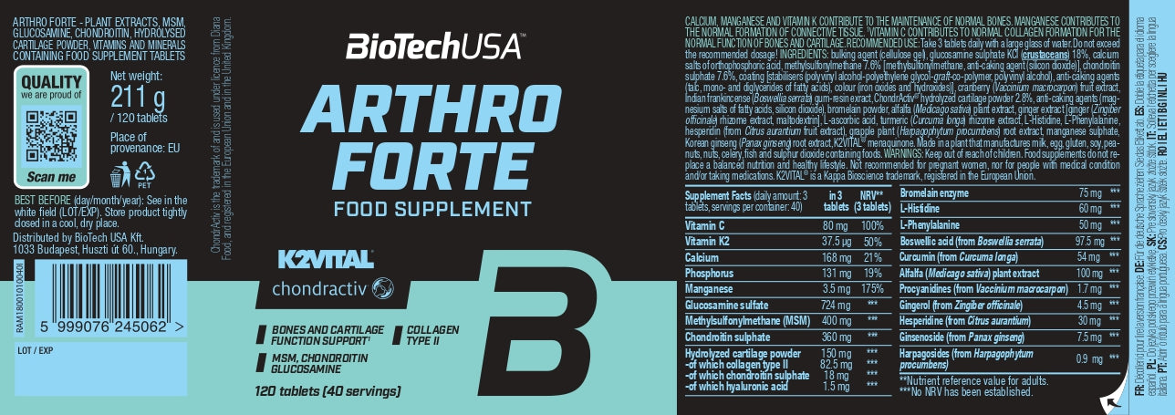 De Arthro Forte tabletten bevatten, net als alle andere BioTechUSA producten, veilige en zorgvuldig geselecteerde ingrediënten.