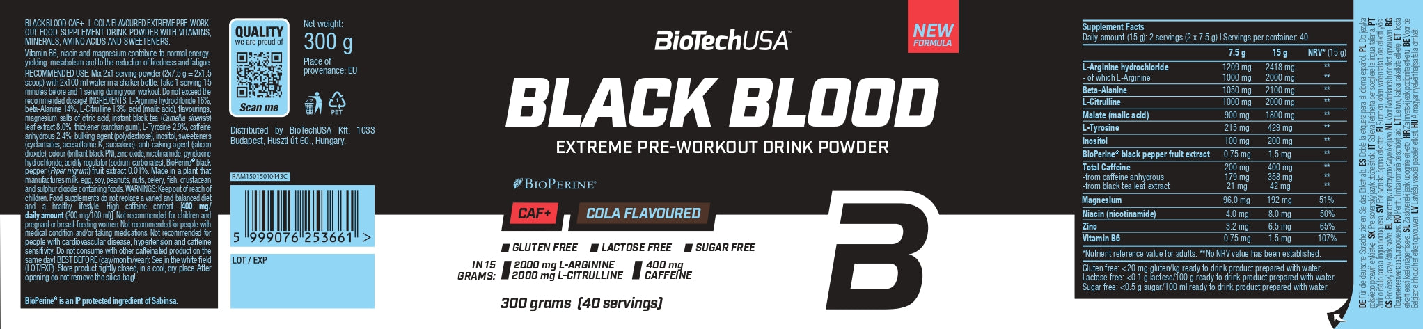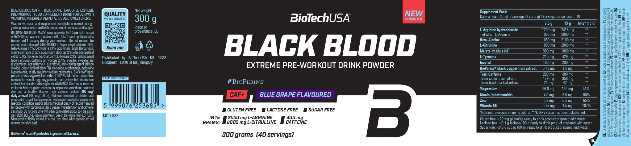 Black Blood CAF+ bevat net als alle andere BioTechUSA-producten veilige en zorgvuldig geselecteerde ingrediënten.