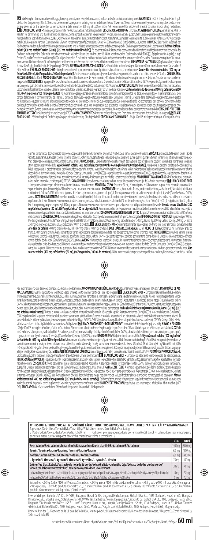WAARSCHUWING: Hoog cafeïnegehalte (200 mg cafeïne / dosis [30 ml], 667 mg cafeïne / 100 ml product). De aanbevolen dagelijkse hoeveelheid niet overschrijden! Het wordt niet aanbevolen voor gebruik bij bekende onderliggende ziekten, evenals voor medicatie, hoge bloeddruk en cafeïnegevoeligheid, en voor kinderen, zwangere of zogende vrouwen! Een voedingssupplement is geen vervanging voor een evenwichtige, gevarieerde voeding en een gezonde levensstijl! Houd het product buiten bereik van kleine kinderen!