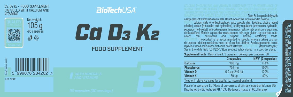 De Ca D3 K2-capsule van BioTechUSA bevat – net als alle andere producten van het merk – zorgvuldig geselecteerde en veilige ingrediënten.