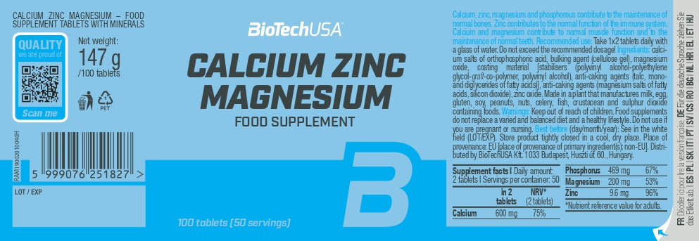 Calcium Zinc Magnesium bevat net als alle andere BioTechUSA-producten veilige en zorgvuldig geselecteerde ingrediënten.