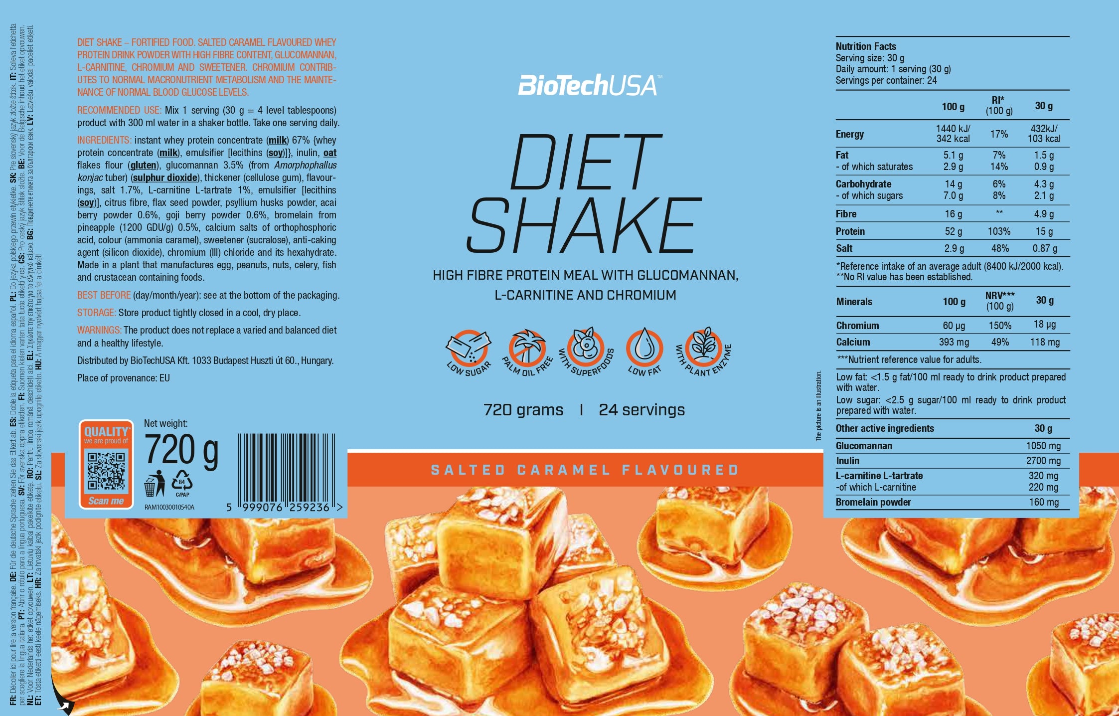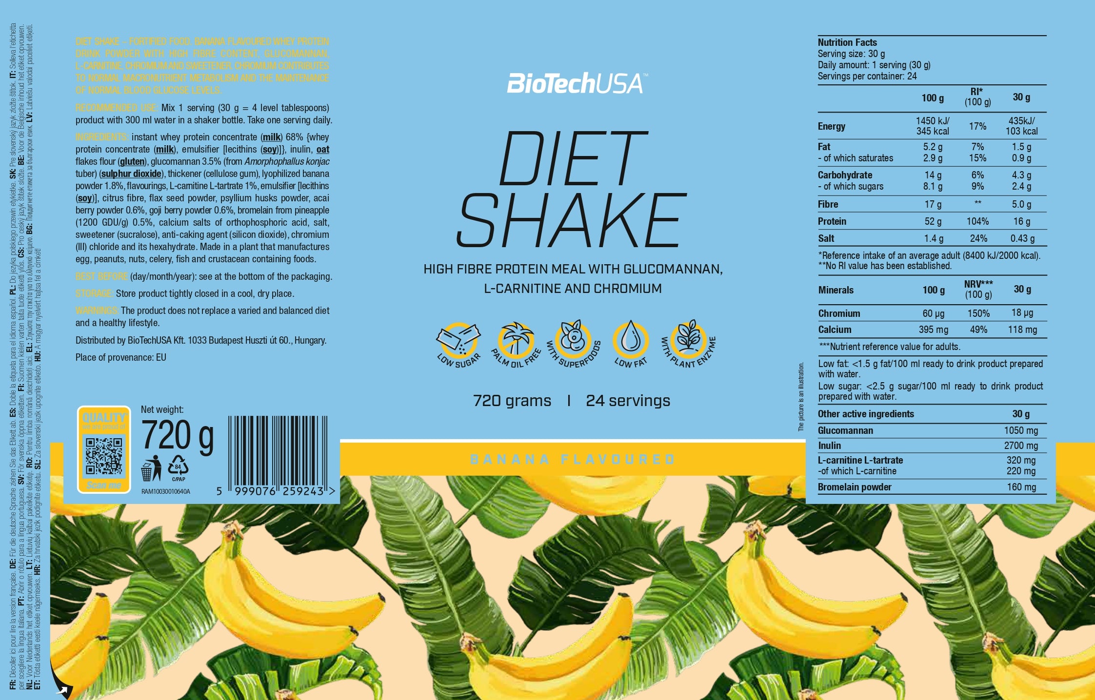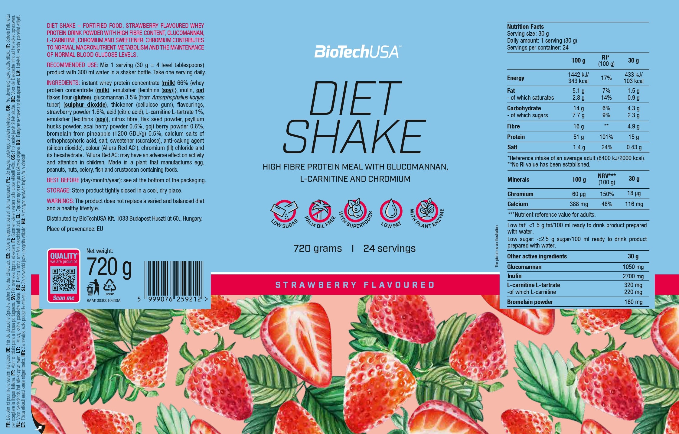 Instant wei-eiwitconcentraat 67% {wei-eiwitconcentraat, emulgator [lecithinen (soja)]}, inuline, havermeel (gluten), glucomannan 3,5% (van de knol van Amorphophallus konjac) (zwaveldioxide), verdikkingsmiddel (cellulosegom), aroma’s, keukenzout 1,7%, L-carnitine-L-tartraat 1%, emulgator [lecithinen (soja)], citrusvezels, lijnzaadpoeder, psylliumvezelpoeder, açaibespoeder 0,6%, gojibespoeder 0,6%, bromelaïne (afkomstig uit ananas, 1200 GDU/g) 0,5%, calciumzouten van orthofosforzuur, kleurstof (ammoniak-karamel), zoetstof (sucralose), antiklontermiddel (siliciumdioxide), chroom(III)chloride en zijn hexahydraat.
