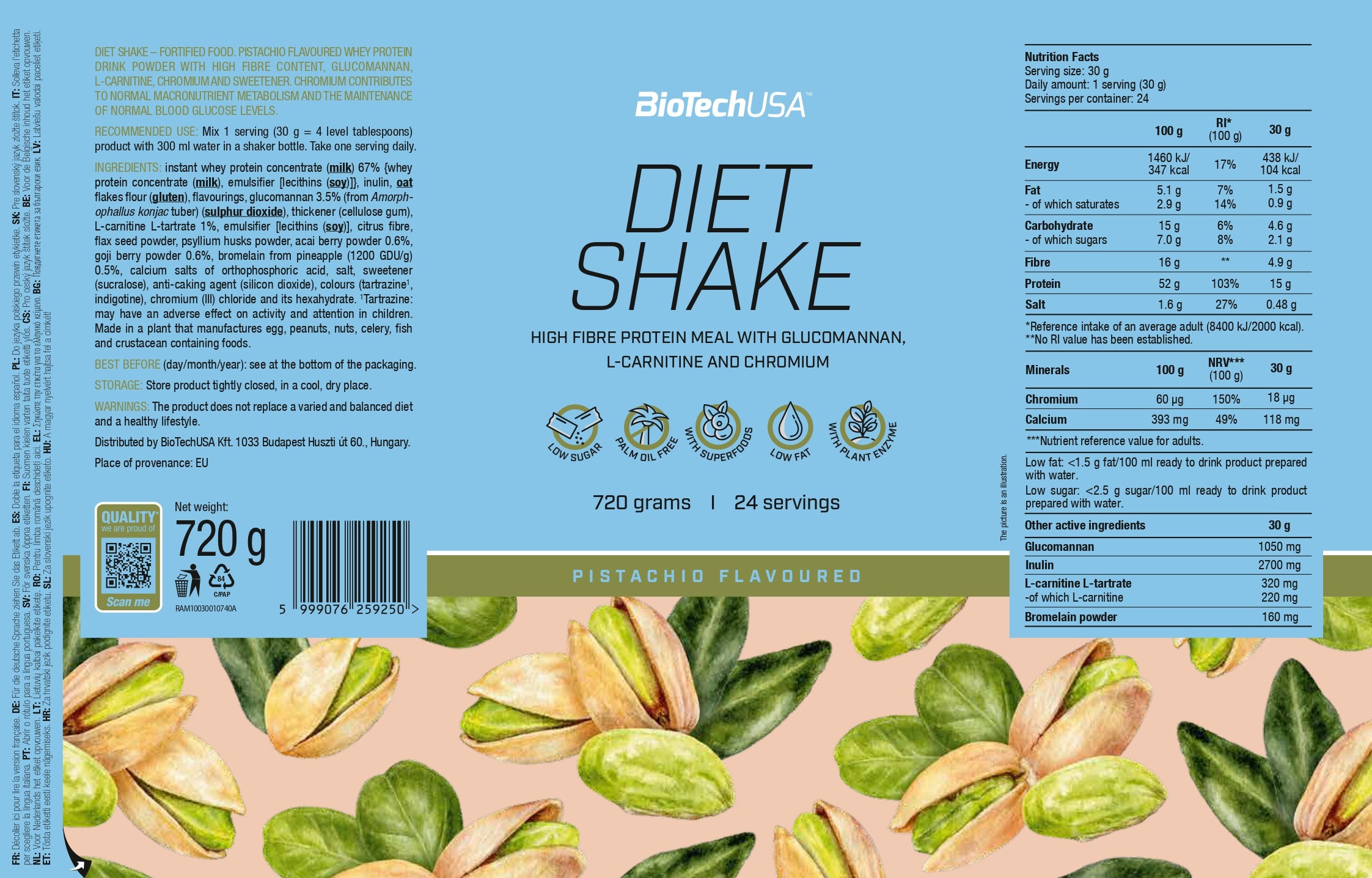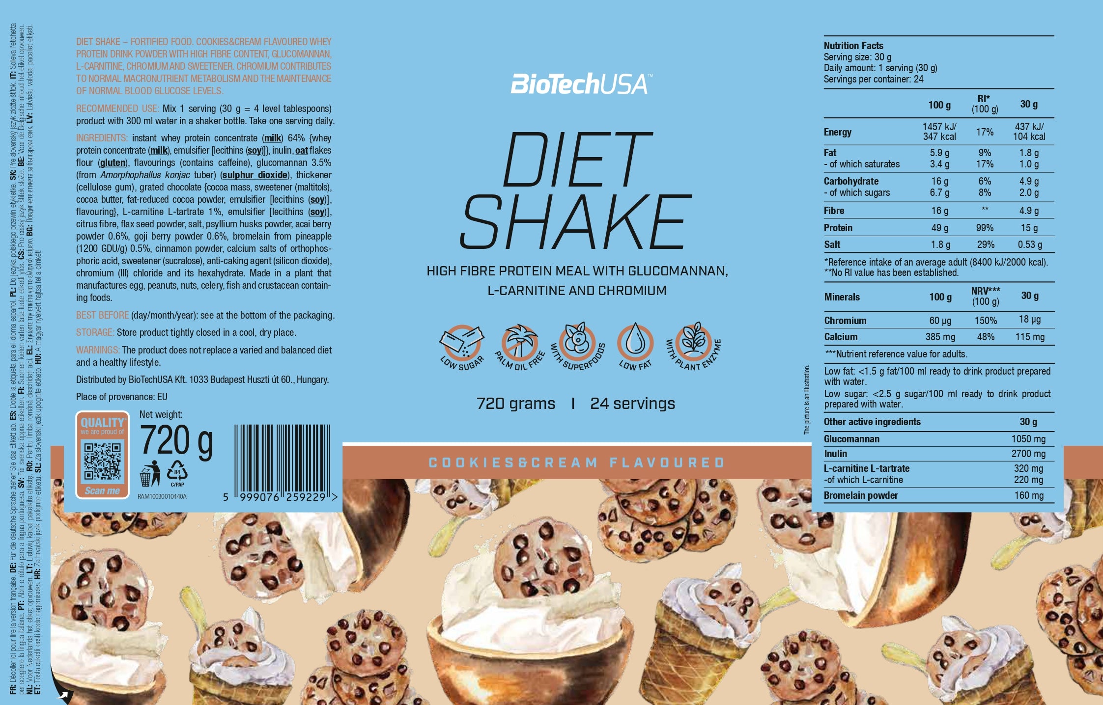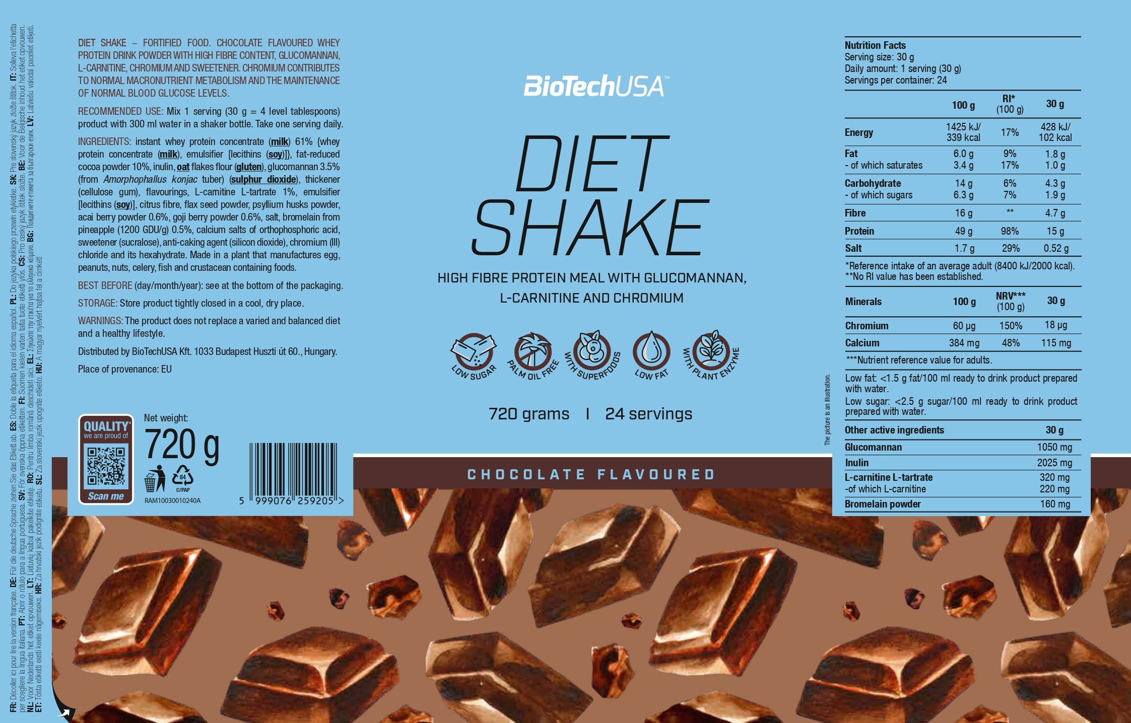 Instant wei-eiwitconcentraat 67% {wei-eiwitconcentraat, emulgator [lecithinen (soja)]}, inuline, havermeel (gluten), glucomannan 3,5% (van de knol van Amorphophallus konjac) (zwaveldioxide), verdikkingsmiddel (cellulosegom), aroma’s, keukenzout 1,7%, L-carnitine-L-tartraat 1%, emulgator [lecithinen (soja)], citrusvezels, lijnzaadpoeder, psylliumvezelpoeder, açaibespoeder 0,6%, gojibespoeder 0,6%, bromelaïne (afkomstig uit ananas, 1200 GDU/g) 0,5%, calciumzouten van orthofosforzuur, kleurstof (ammoniak-karamel), zoetstof (sucralose), antiklontermiddel (siliciumdioxide), chroom(III)chloride en zijn hexahydraat.