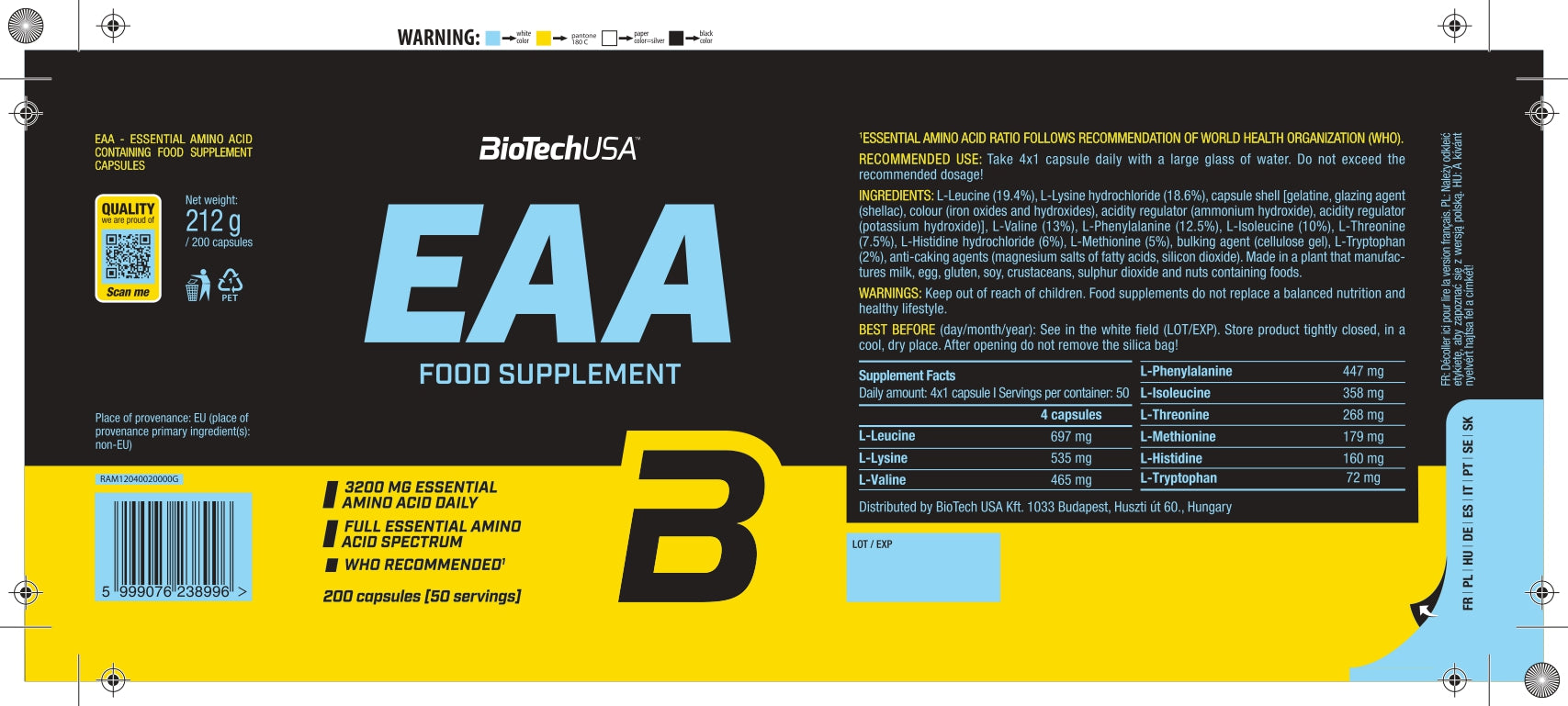 EAA capsule bevat net als alle andere BioTechUSA-producten veilige en zorgvuldig geselecteerde ingrediënten.