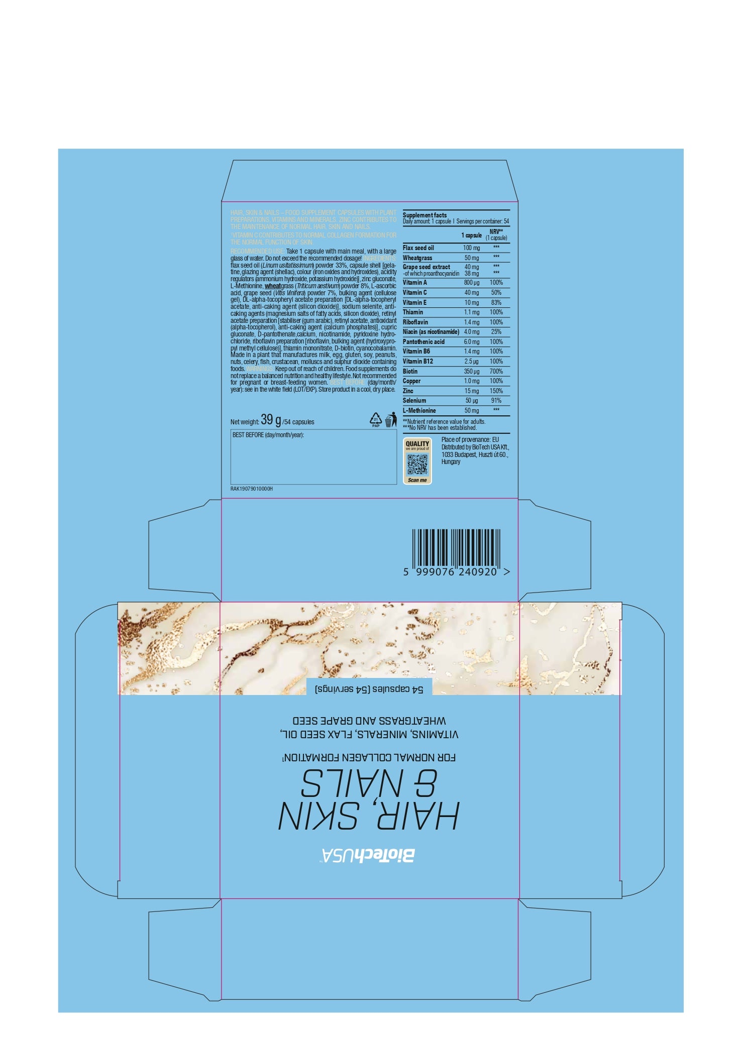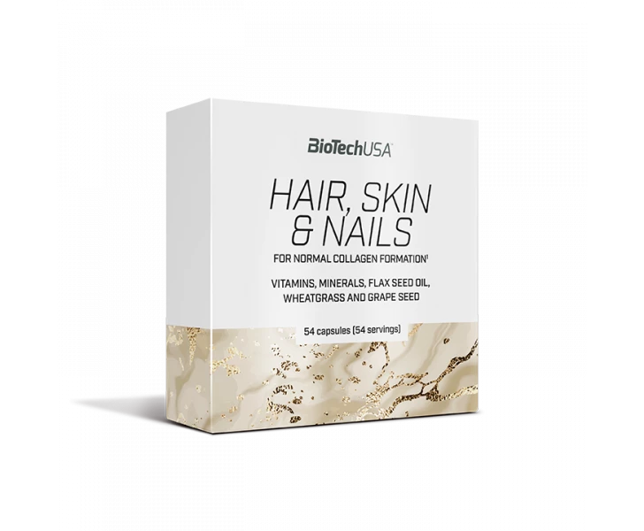 BioTechUSA Hair, Skin & Nails capsules bevatten naast vitamines en mineralen ook lijnzaadolie, tarwegras en druivenpitolie (proanthocyanine).