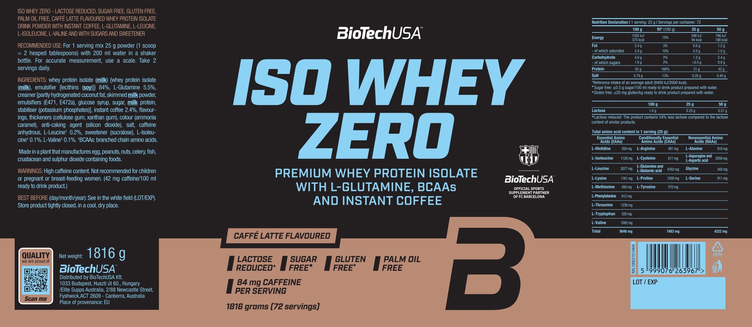 Premium wei-eiwit isolaat poeder drank met verlaagd lactosegehalte, zonder suiker en glutenvrij, met toegevoegde BCAA's en glutamine-aminozuren, zoetstoffen en suikers. ⚠️ Let op: caffe latte smaak hoog cafeïnegehalte (88 mg/portie).
