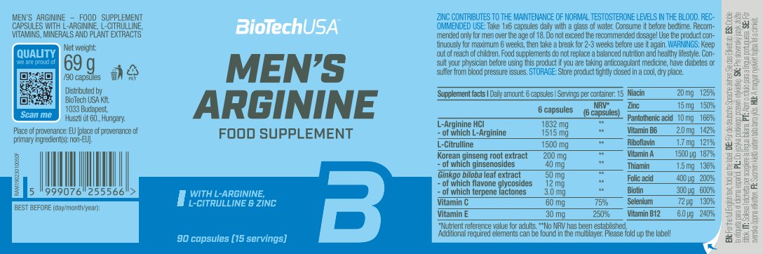 Men's Arginine bevat net als alle andere BioTechUSA-producten veilige en zorgvuldig geselecteerde ingrediënten.