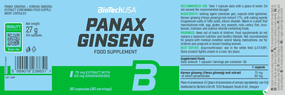 Gewoonlijk wordt de hele plant of de wortel ervan gebruikt in gedroogde en gemalen vorm, bijvoorbeeld in smoothies, eiwitshakes of diverse gerechten. De ginsenoside-inhoud van de BioTechUSA Panax Ginseng komt uitsluitend uit het stengel- en bladextract van de plant. Dankzij de capsulevorm is het gemakkelijk in te nemen, en 1 capsule bevat al een optimale hoeveelheid van het plantenextract. Dit maakt het product zeer economisch – één verpakking is voldoende voor maar liefst twee maanden.