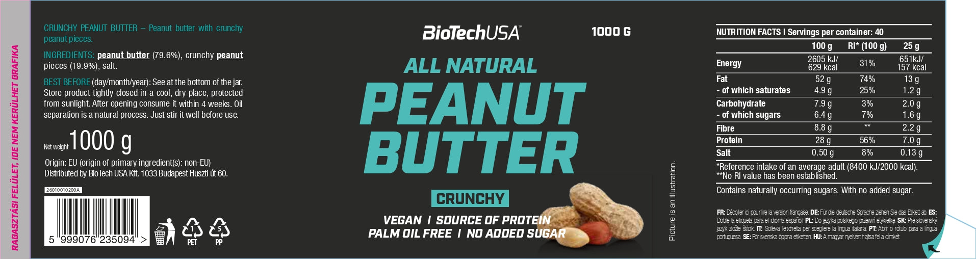 De BioTechUSA Peanut Butter is een uitstekende bron van eiwitten en vezels, en past perfect in een gezond en gevarieerd eetpatroon. Ideaal voor op brood, in smoothies, of als voedzaam tussendoortje – waar en wanneer jij maar wilt.