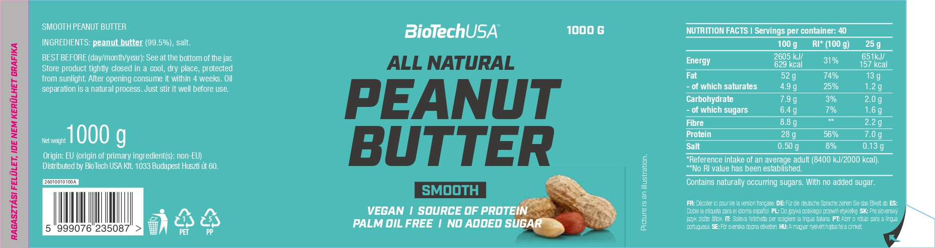 BioTechUSA Peanut Butter is een pindakaas die alleen pinda's en zout bevat, palmolie vrij, kokosolie vrij, geen conserveringsmiddelen en geen toegevoegde suikers.