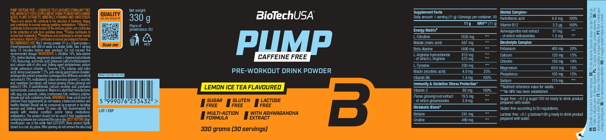 Gemiddelde voedingswaarde – Pump Caffeine Free (Citroen Ijs Thee) | |