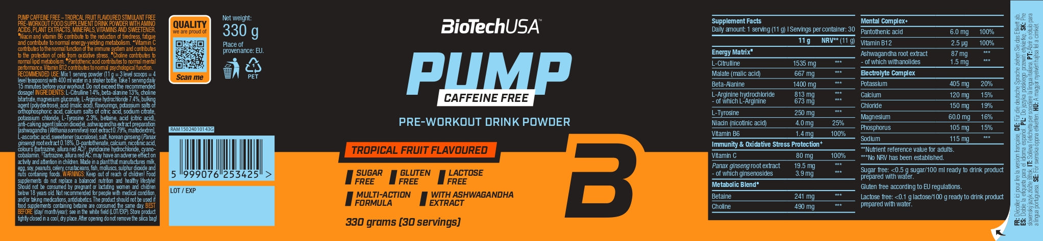 Gemiddelde voedingswaarde – Pump Caffeine Free (Tropische Vruchten) | |