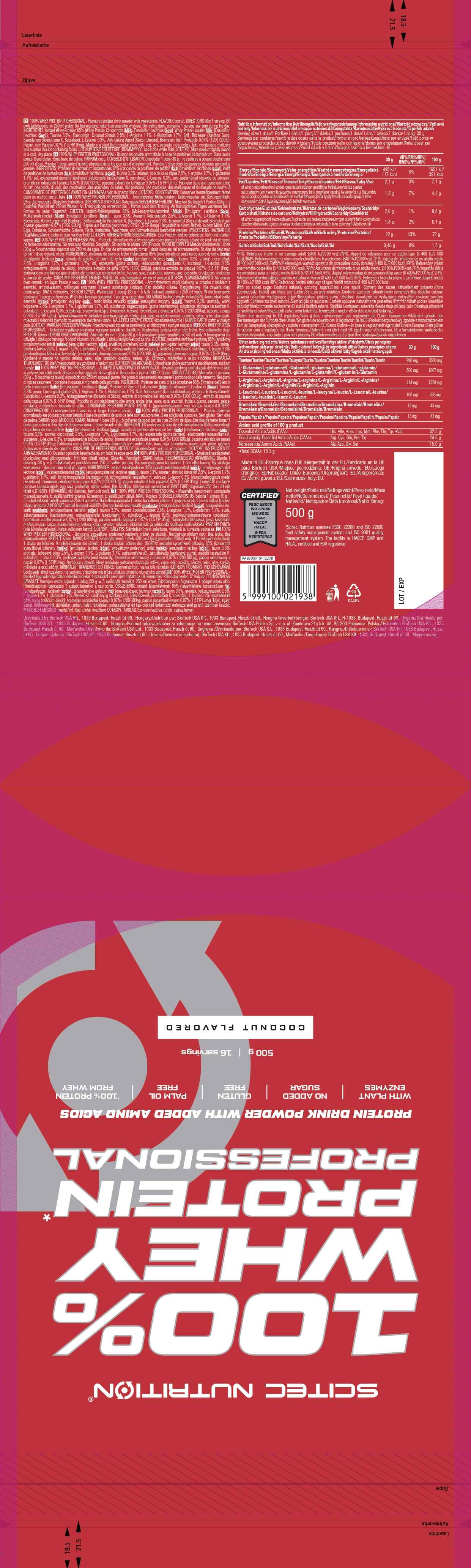 Scitec 100% Whey Protein Professional - een mengsel van wei-eiwitconcentraat en -isolaat, verrijkt met extra L-leucine, L-glutamine en taurine en een enzymencomplex.