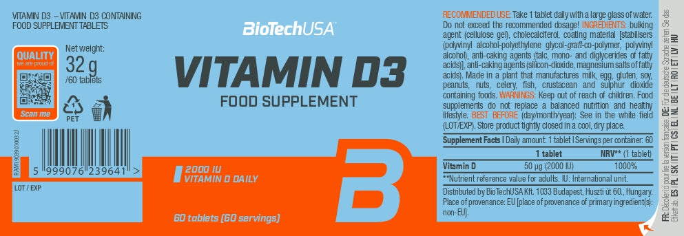 Voedingsmiddelen zoals vette zeevis, levertraan, zuivelproducten en eieren zijn goede natuurlijke bronnen. Wanneer dit niet voldoende is, biedt de BioTechUSA Vitamine D3-tablet een uitstekende oplossing – met maar liefst 2000 IE (50 µg) vitamine D per tablet.